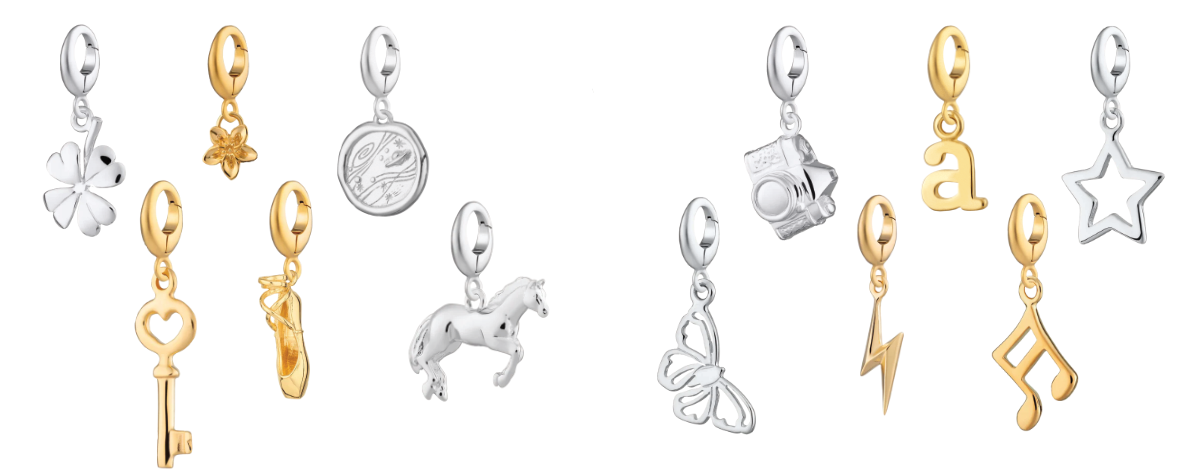 All charms are made from sterling silver, and each charm is available in sterling silver or gold plated. Build your unique charm bracelet or necklace with a large choice of designs!