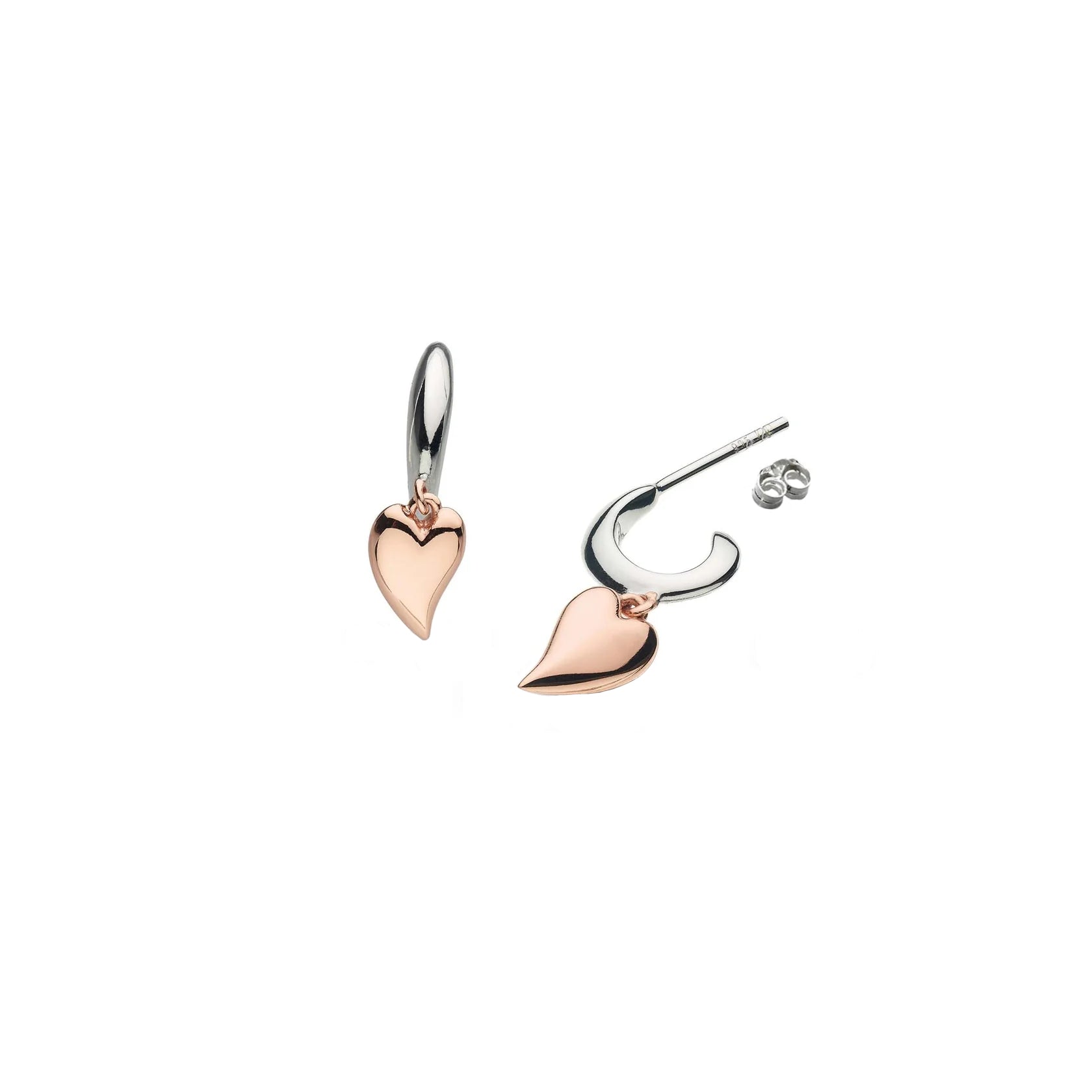 Curvaceous and petite, the Kiss mini hearts are blushing in 18ct rose gold plate and rhodium plate finished sterling silver. The hoop style fitting gently hugs the ear for a close fit. The perfect earring style to wear again and again.