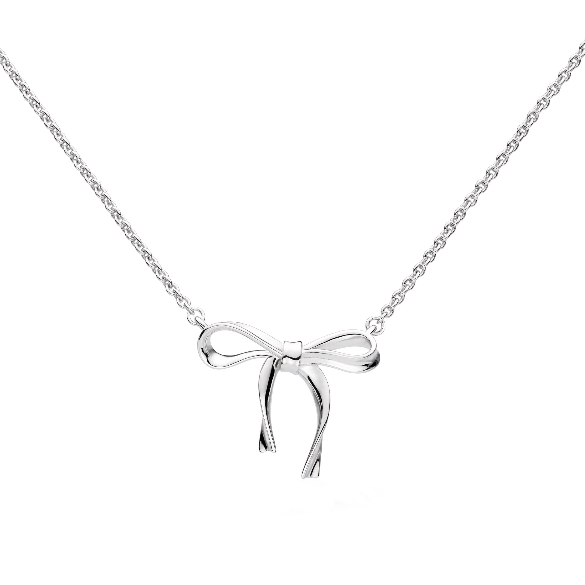The Serenity Ribbon Bow Necklace is exquisitely crafted in beautiful Sterling Silver. Showcasing a graceful and sophisticated ribbon bow design, this simple necklace adds a touch of refinement to any style and ensemble.