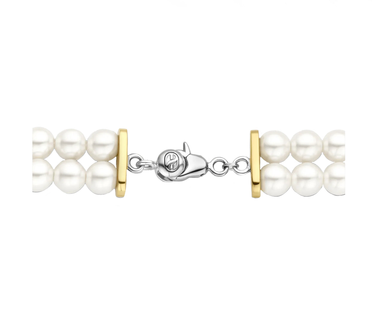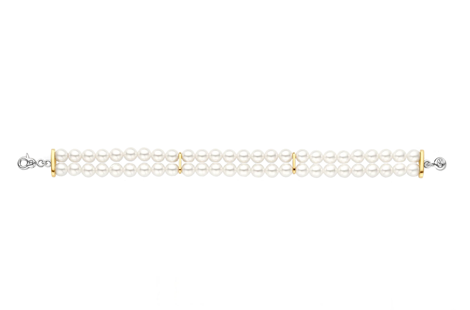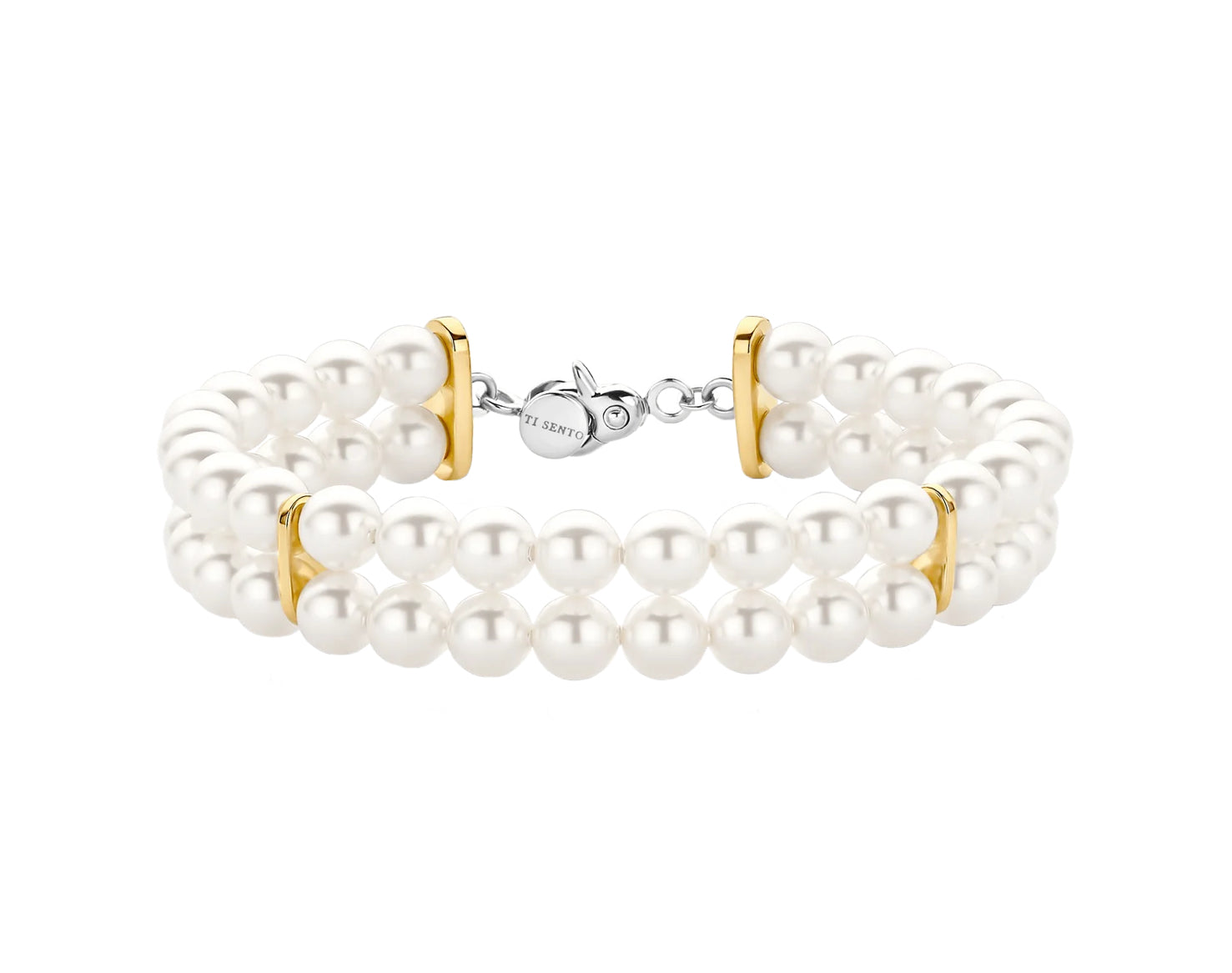 Crafted from premium 925 sterling silver, this bracelet features two rows of lustrous white pearls, accented with yellow gold-plated details that add a warm, luxurious glow. The design is completed with a secure and beautifully crafted clasp that ensures both style and peace of mind. Its timeless elegance and radiant charm make it the perfect accessory for sunlit days and balmy evenings, pairing effortlessly with casual outfits or formal ensembles. Hypoallergenic and nickel-free, this bracelet offers exceptional comfort and quality, making it a versatile and cherished addition to your jewellery collection.